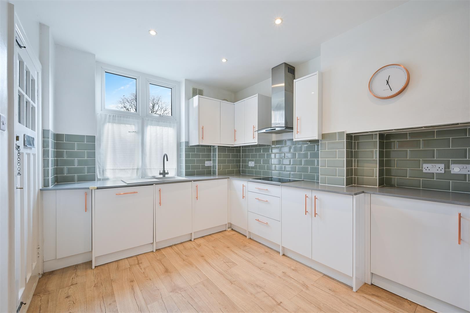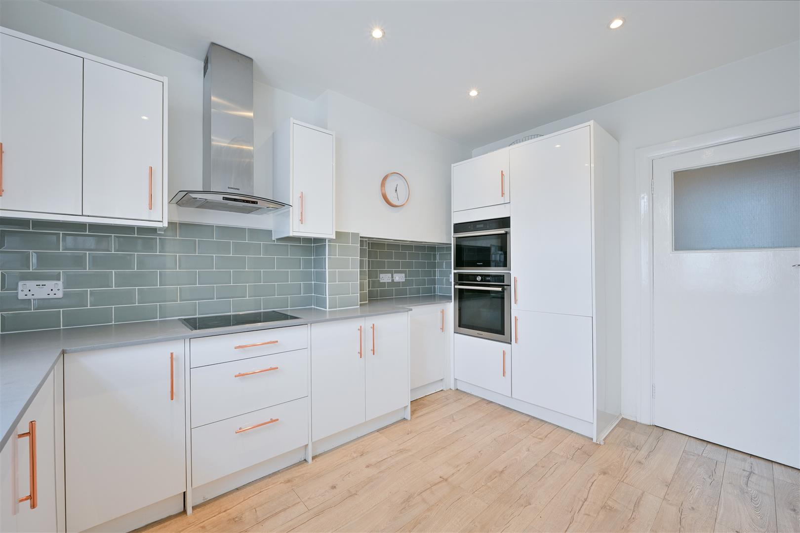- Sleek white kitchen with integrated appliances
