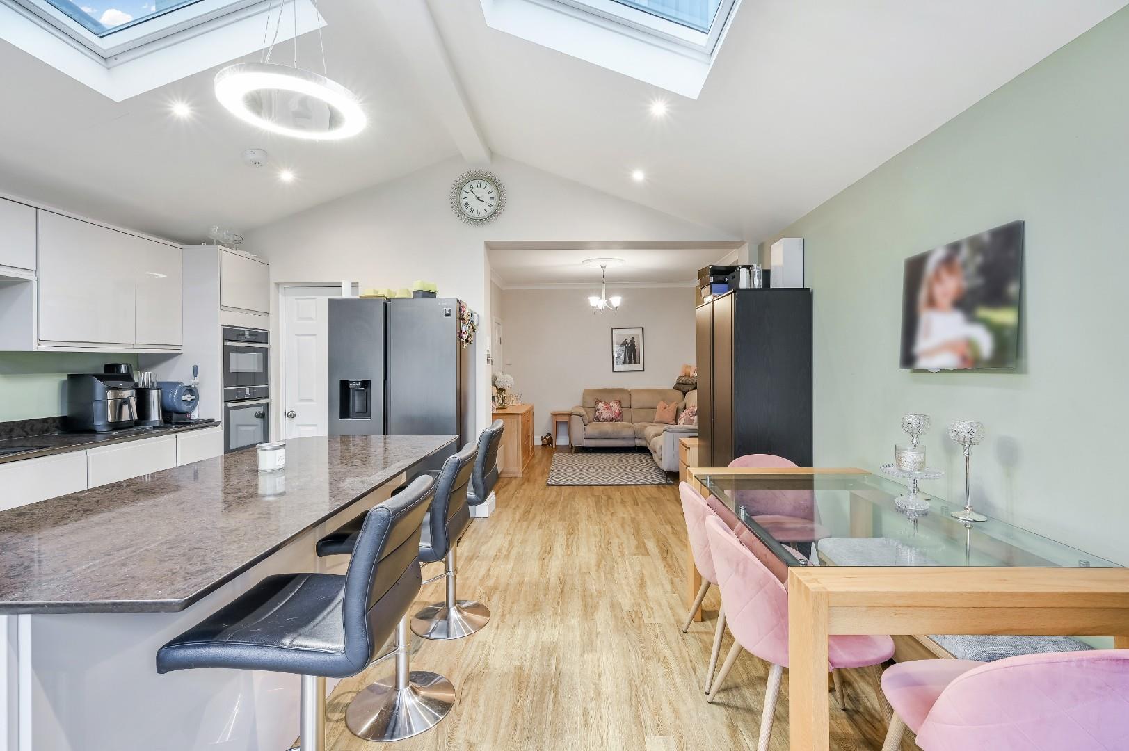 The property is entered via an enclosed entrance porch leading to a traditional hallway with access to a handy downstairs cloakroom. The ground floor offers both a separate lounge for relaxing and the rear has been been beautifully extended to form an impressive open plan kitchen/dining/family room with two large electrically operated skylight windows which flood the space with natural light. The kitchen is fitted with a matching range of floor and wall mounted units with a matching central island and there is a useful separate utility room with space and plumbing for the washing machine and tumble dryer.