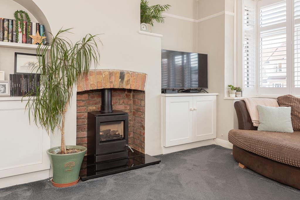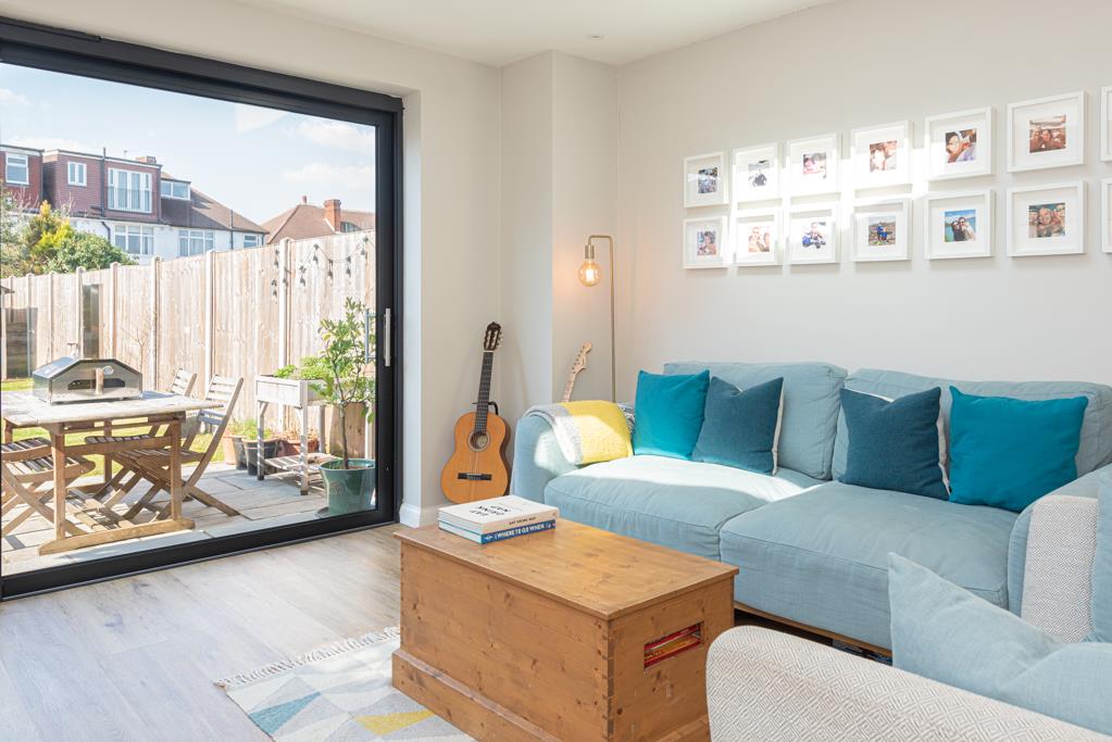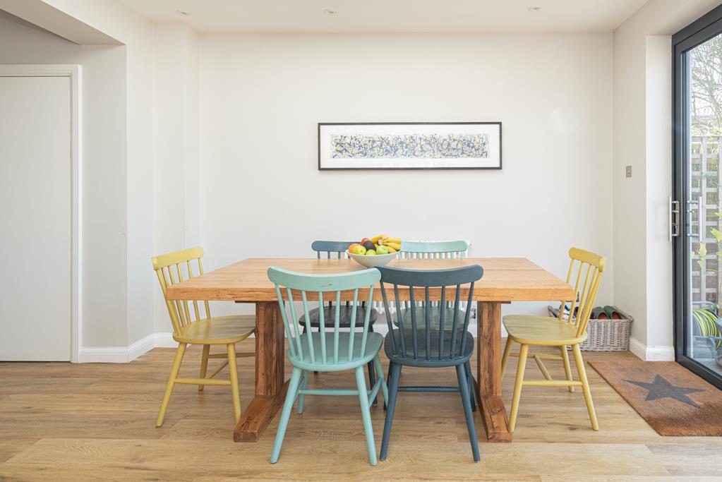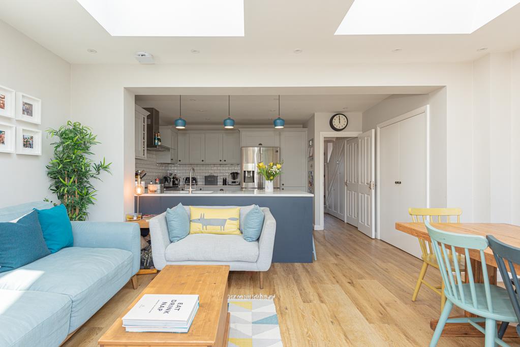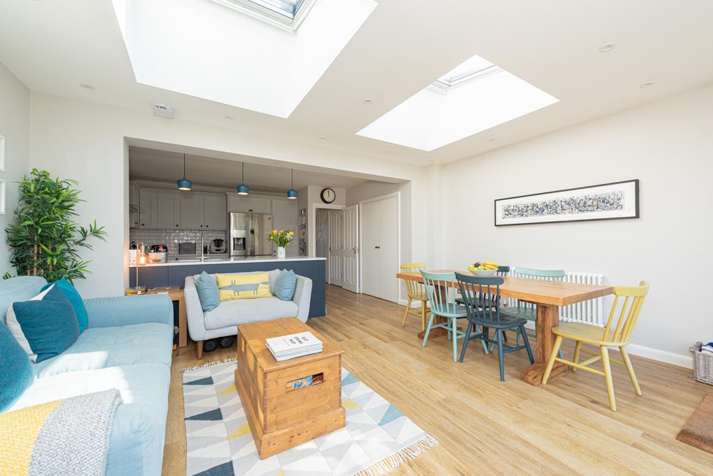 The property offers a stylish open plan kitchen / dining / living space to the rear with Velux windows above and sliding double glazed doors which span the width of the rear wall and allow in plenty of natural light. Separately downstairs is a spacious lounge with a fireplace and bay window.