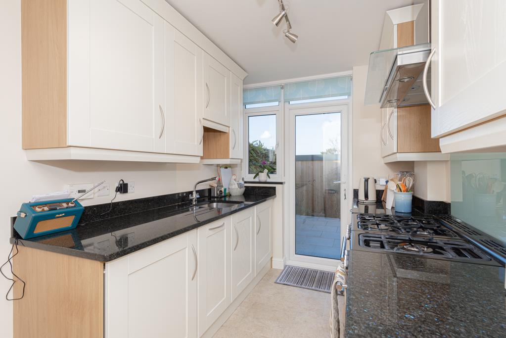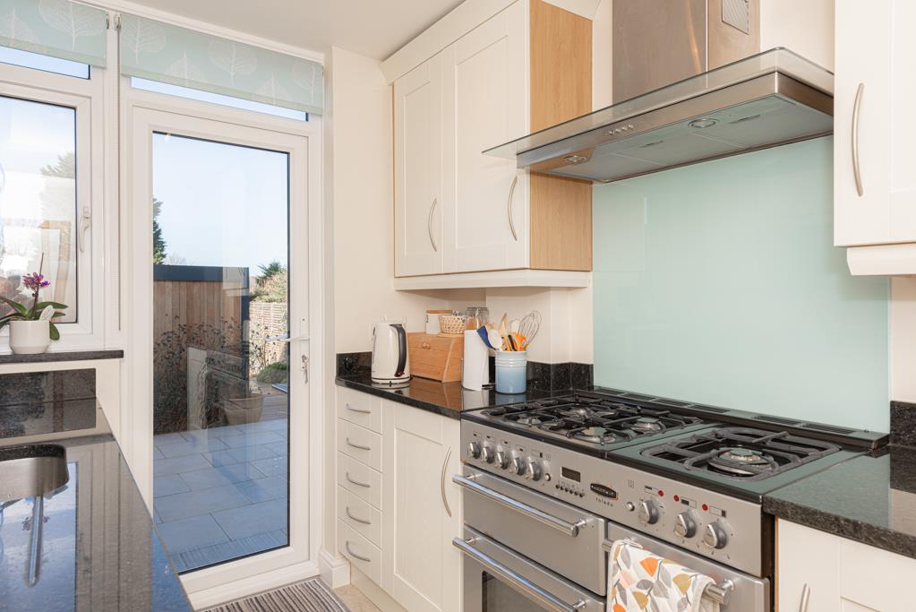 The modern and stylish kitchen has granite work surfaces and also has a door to the garden.