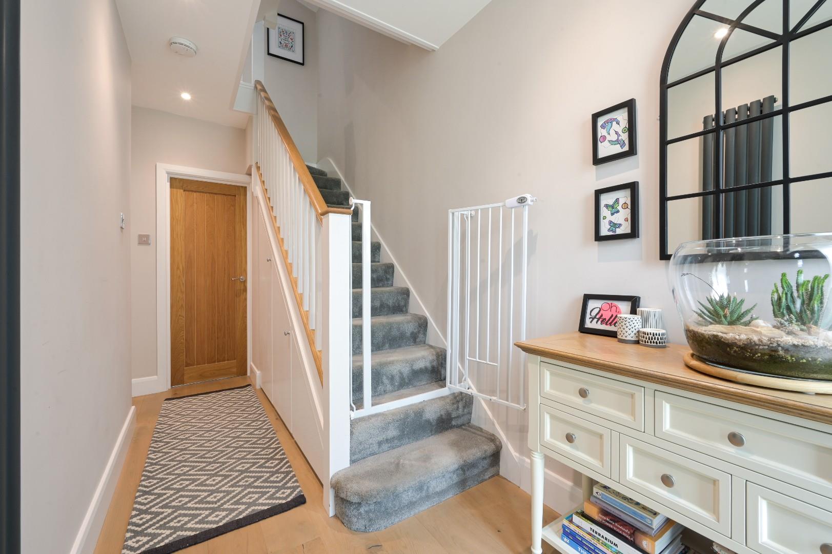You approach the home via blocked paved driveway with EV charging leading to an enclosed double glazed entrance porch with door to the entrance hall and stairs to the first floor landing.