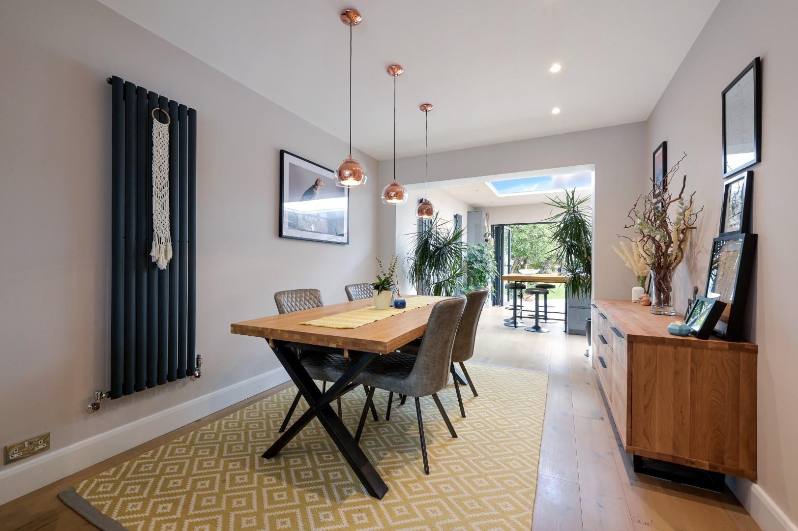 From here you access the dining room with space for table and chairs and access to a stunning rear kitchen extension with a matching range of floor and wall mounted units in light grey with contrasting worktops and matching island and breakfast bar perfect for entertaining. This space is flooded with natural light via a huge lantern window and bi-folding doors and window which overlooks and leads out to a landscaped rear garden. Off the kitchen is a sperate utility room with space and plumbing for appliances and a handy downstairs cloakroom.