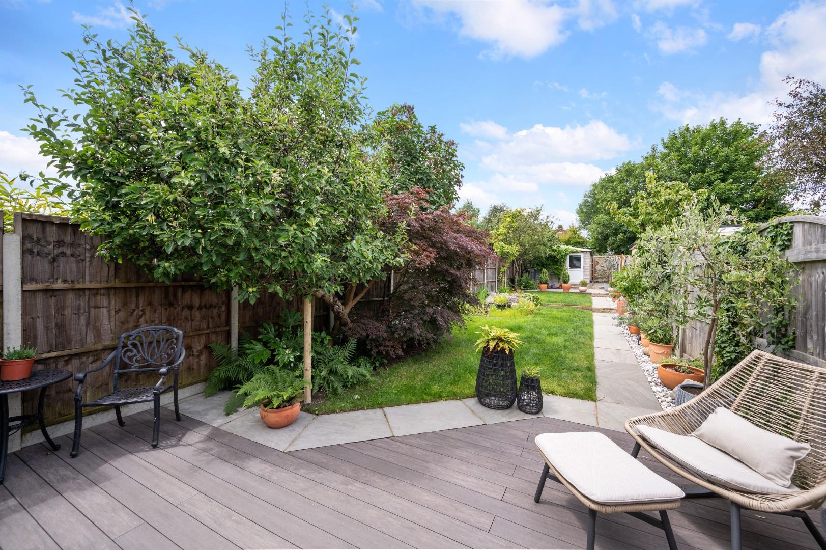 The garden has been beautifully landscaped with composite decking and Indian sandstone paved terrace, pond, level lawn with flower beds stocked with variety of plants trees and shrubs. To the rear is vehicular access to a detached garage with power and lighting