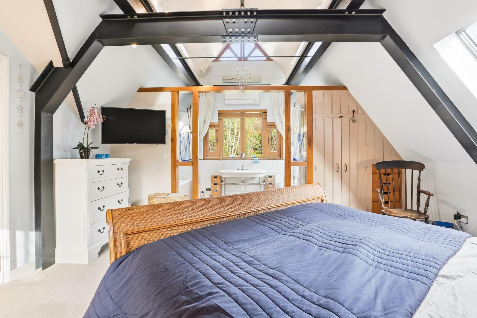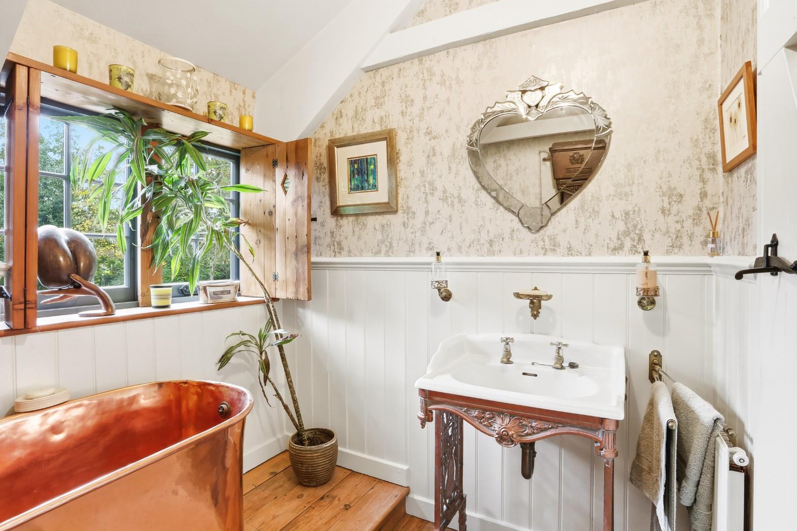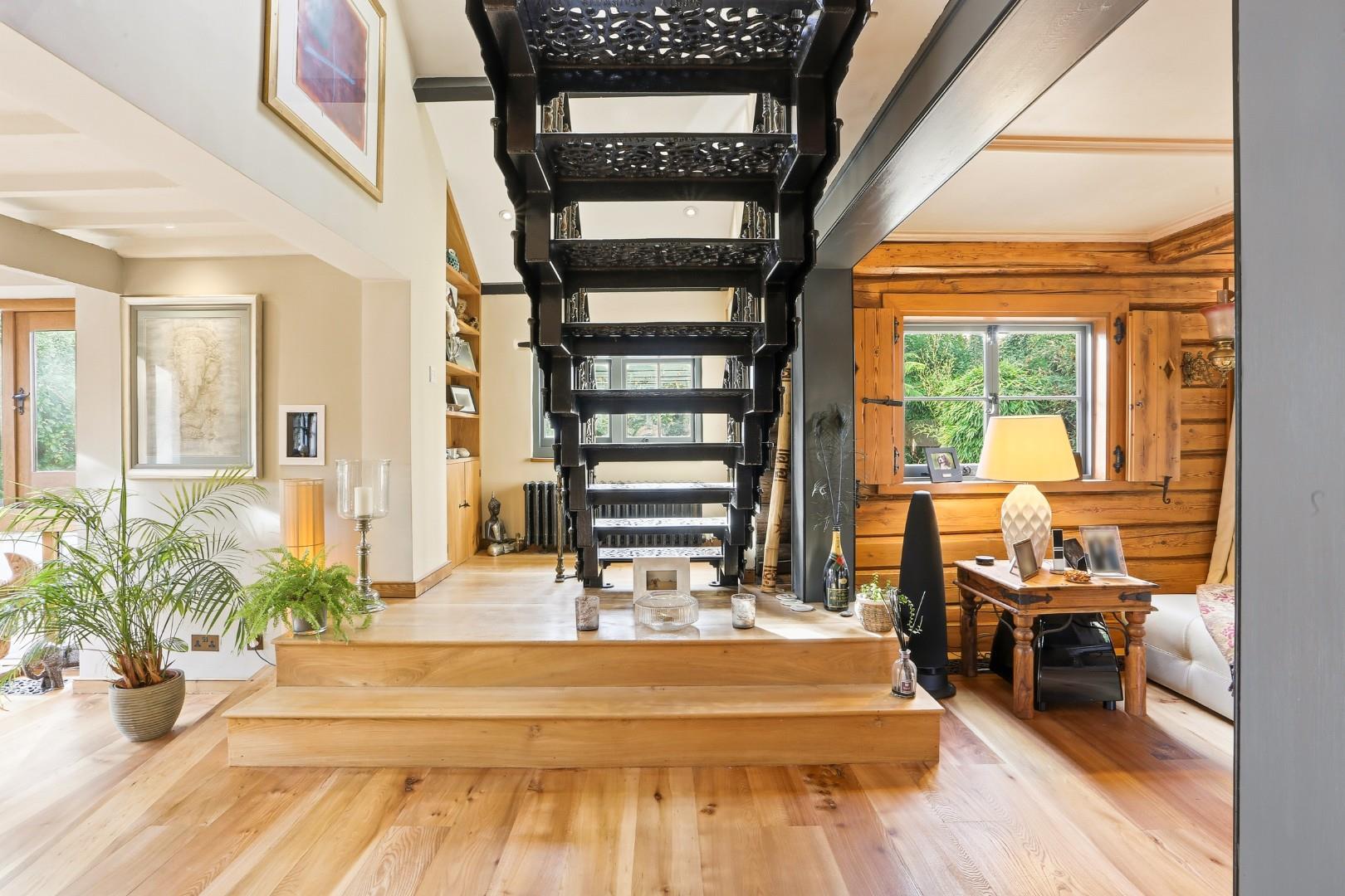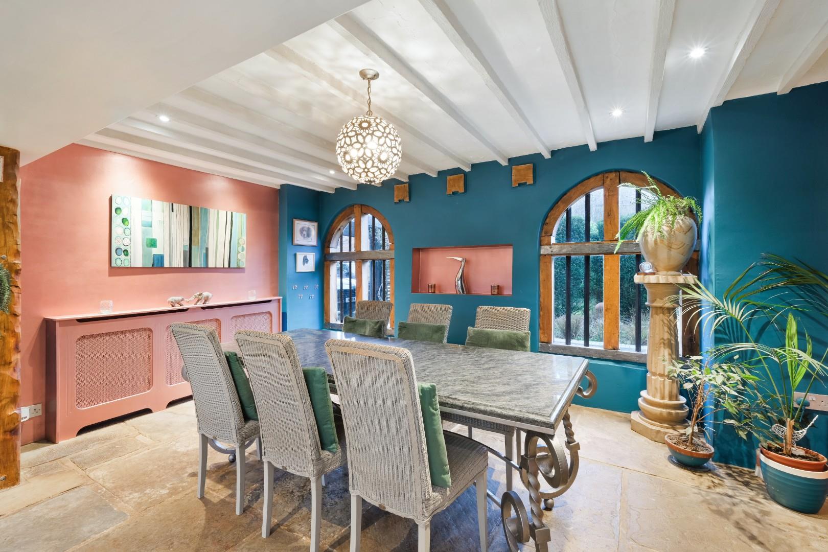 Inside, large flagstone floors lead from the entrance past cloakrooms into a charming solid oak country kitchen/dining room with granite surfaces, Aga and walk-in pantry. Three impressive arched oak windows, reclaimed from Newgate Prison and thought to be up to 500 years old, add unique character. Stable doors open to the rear patio and courtyard, and this level also includes a study and WC.