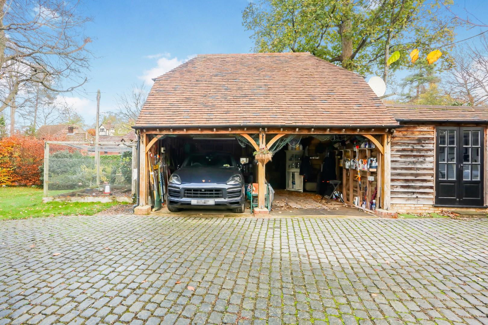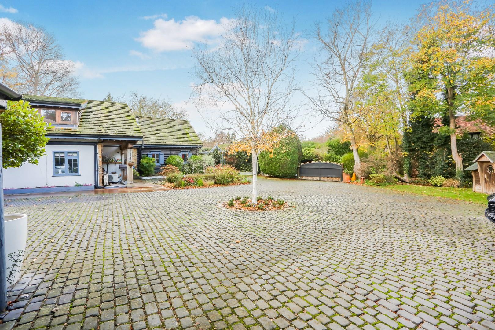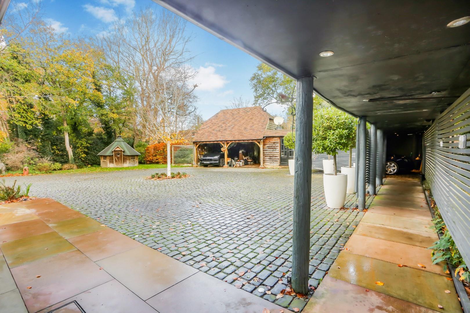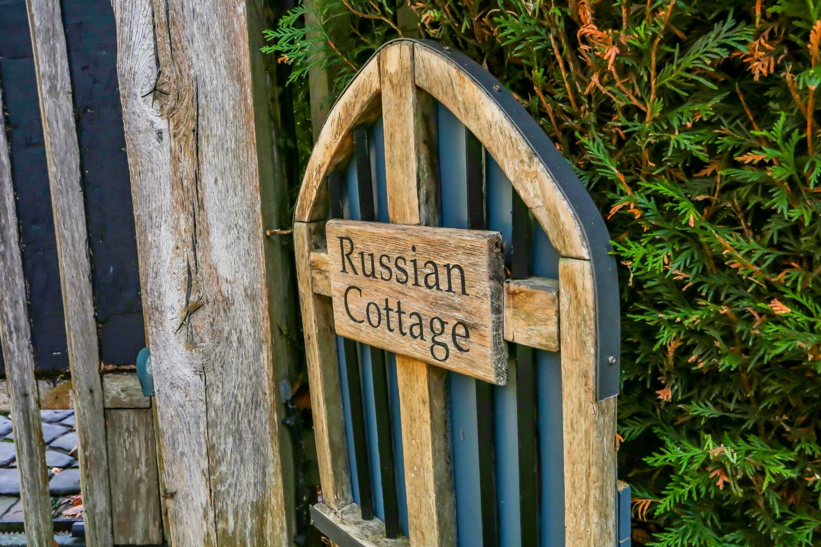Russian Cottage is an exceptional and historically significant home, set off a quiet private track and approached via electric gates onto a large cobblestone driveway with parking for numerous cars. A double garage, car port, walkway and outbuildings form a natural courtyard, beautifully framed by mature trees.