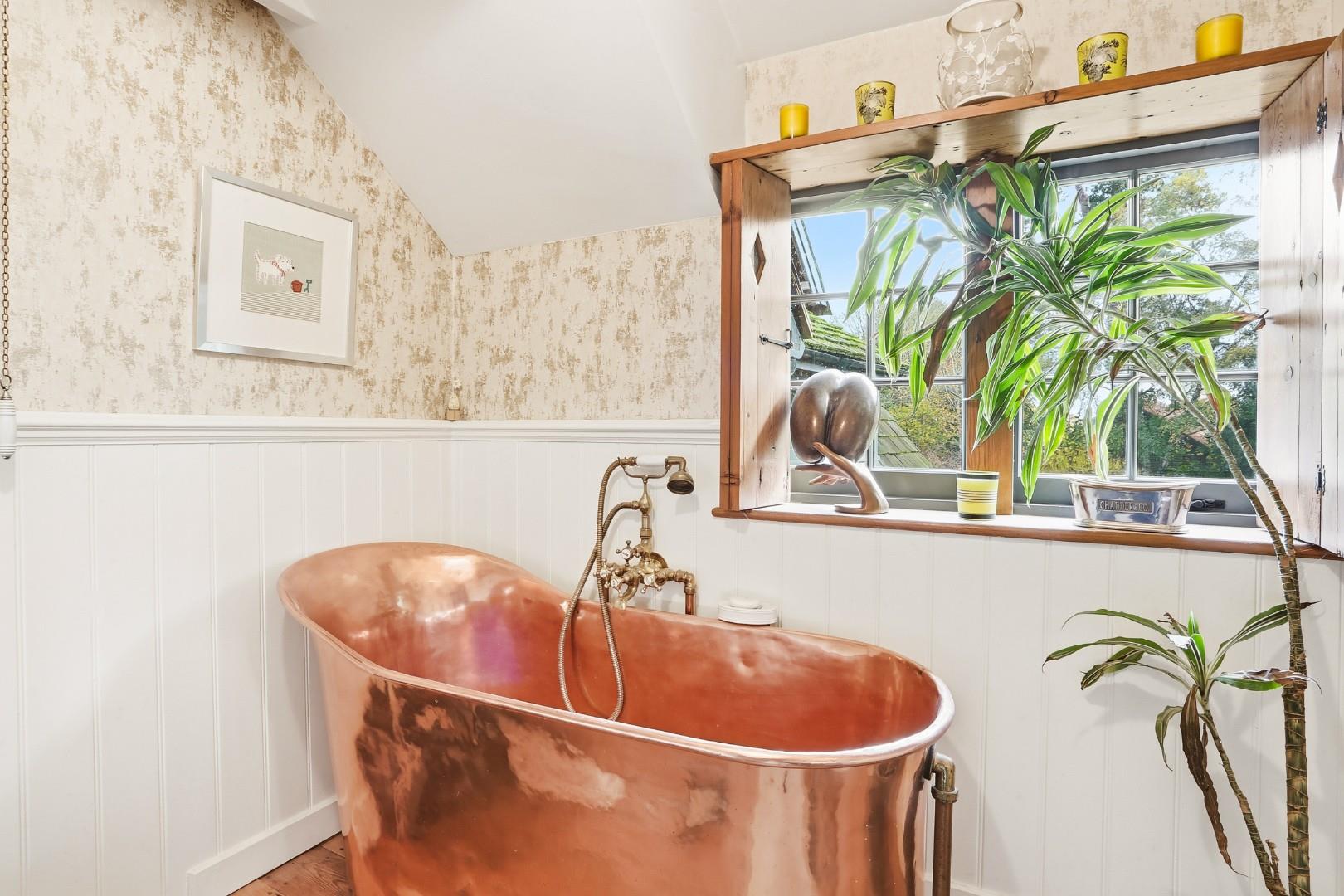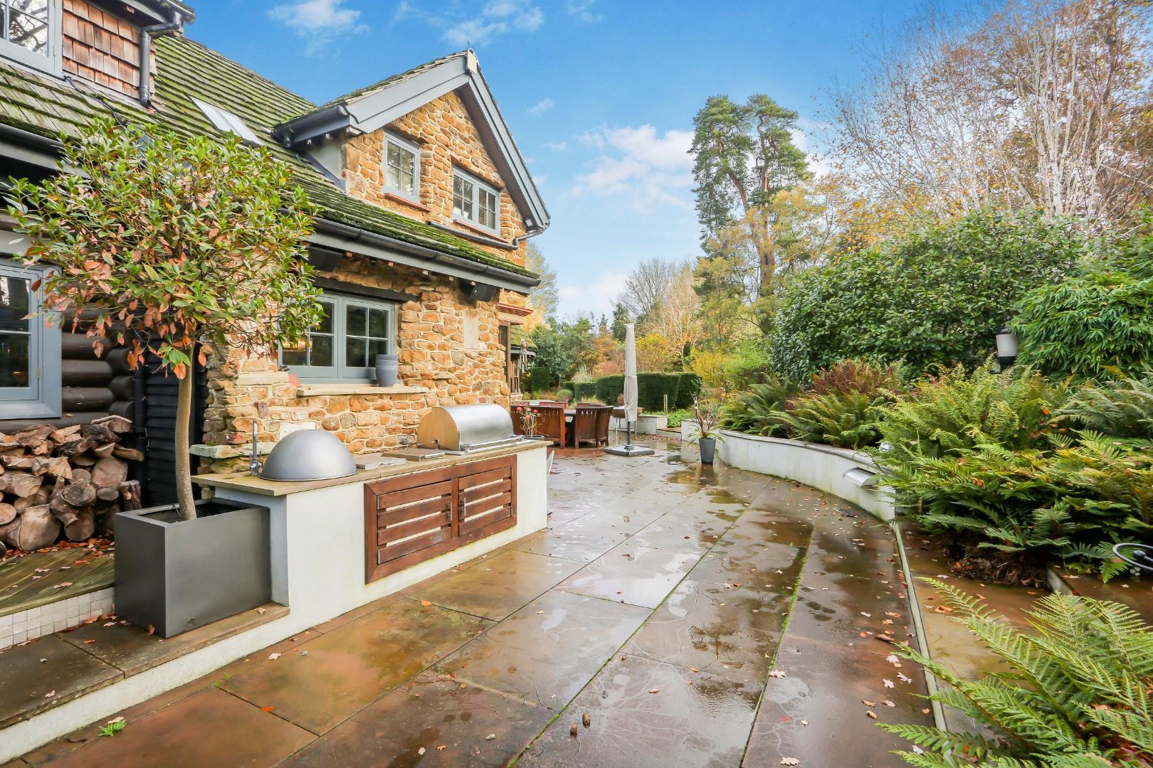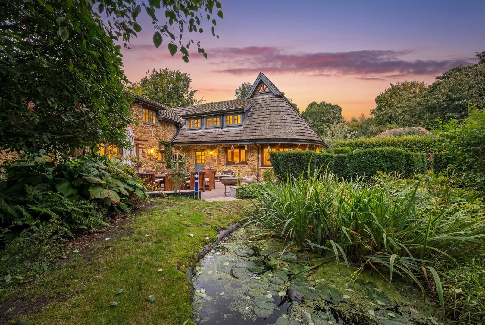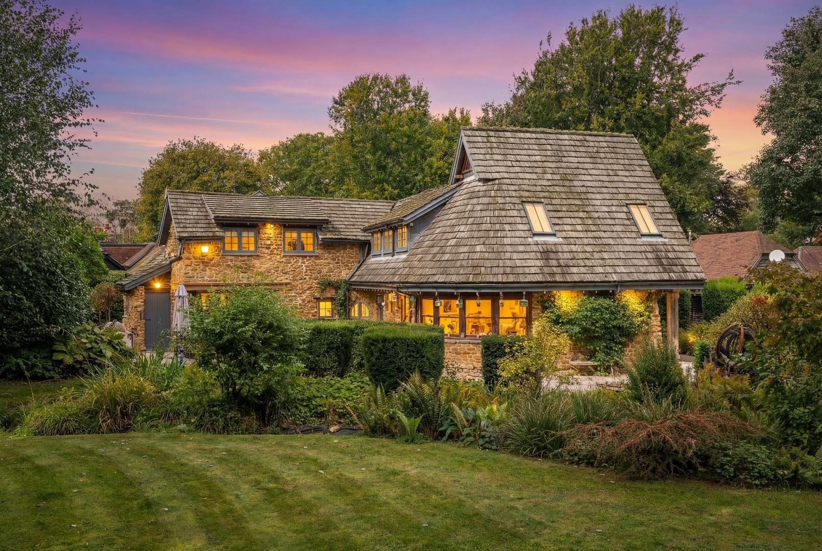 Russian Cottage is an exceptional and historically significant home, set off a quiet private track and approached via electric gates onto a large cobblestone driveway with parking for numerous cars. A double garage, car port, walkway and outbuildings form a natural courtyard, beautifully framed by mature trees.