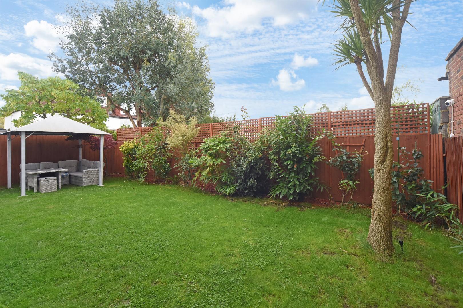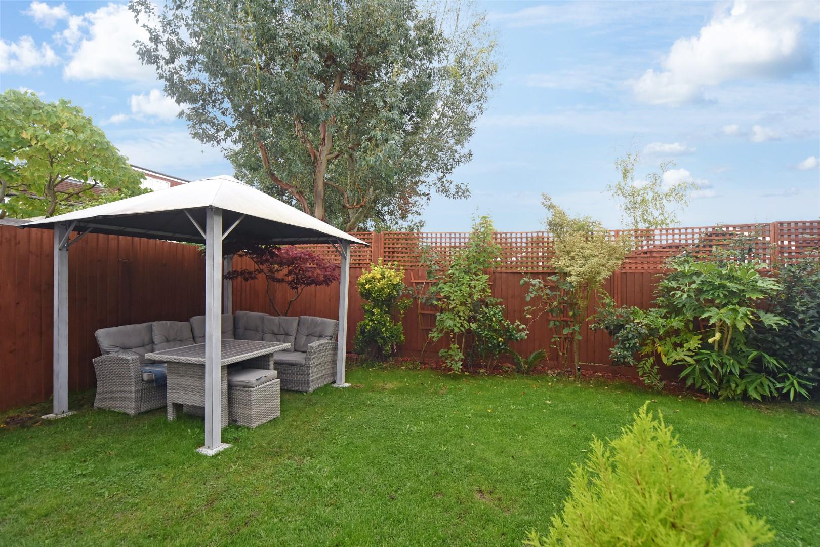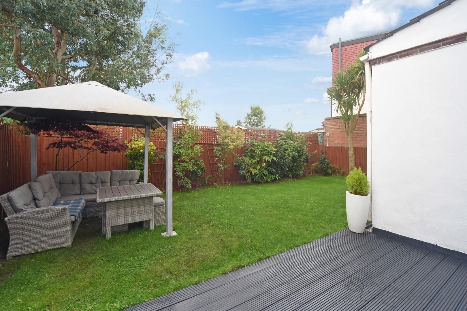 The garden is level and secluded with a decked terrace, area of lawn area enclosed by boarder fencing and side access to the front driveway.