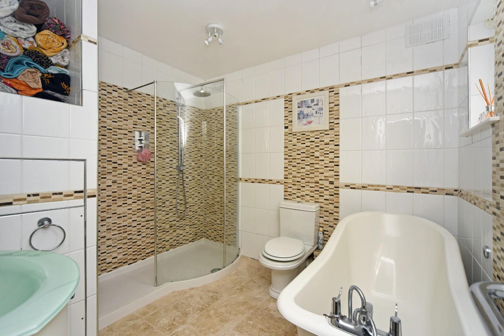 Upstairs there are three double bedrooms all with double glazed windows and a spacious family bathroom fitted with a matching white suite comprising; roll top bath, large walk-in double shower and wash hand basin, low flush W,C and plenty of vanity storage space.
