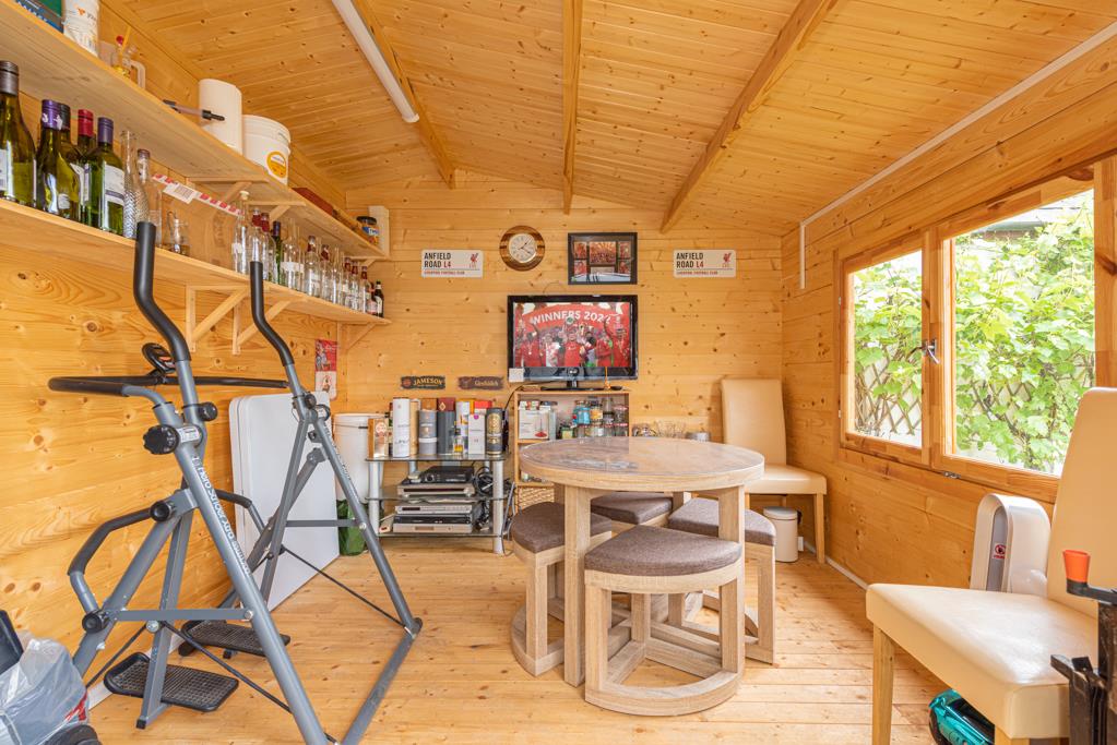 To the front of the property is a driveway which provides parking for at least two cars, while to the side and rear is a garden which is part laid to lawn and part landscaped. A recently built detached insulated timber summer house with full electrics and WiFi