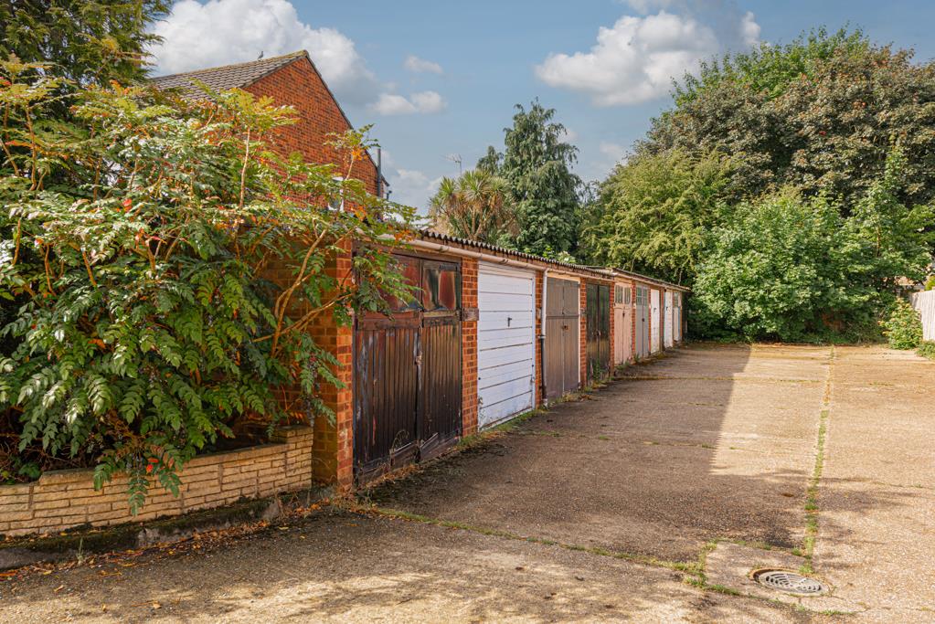 Next to the brick block driveway is a single garage.