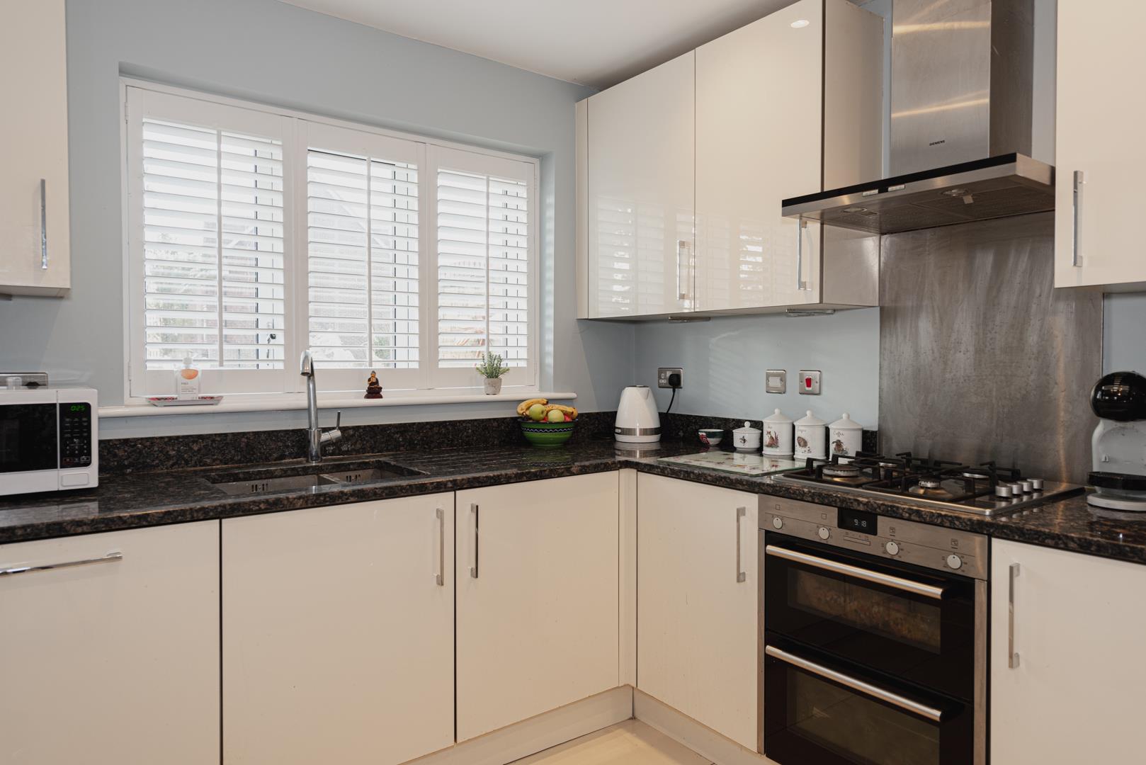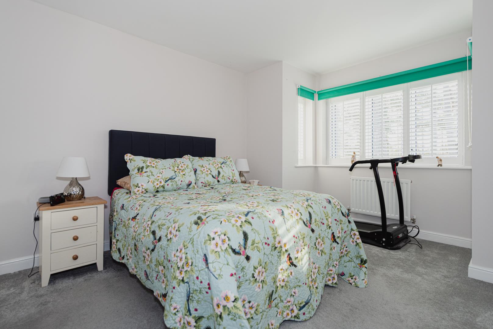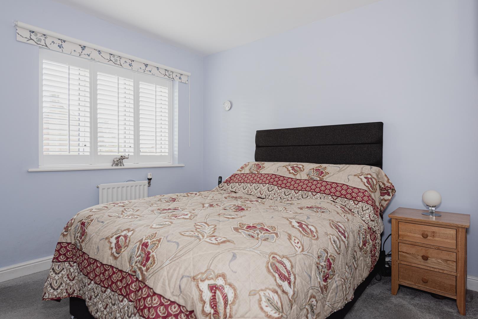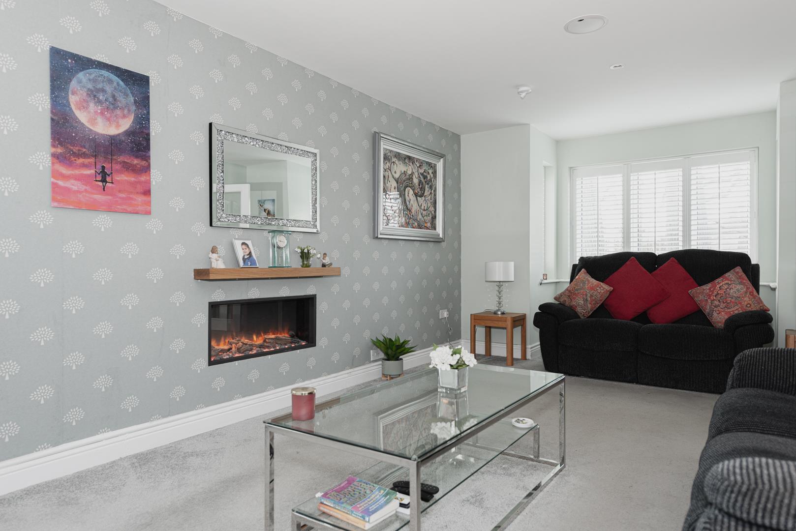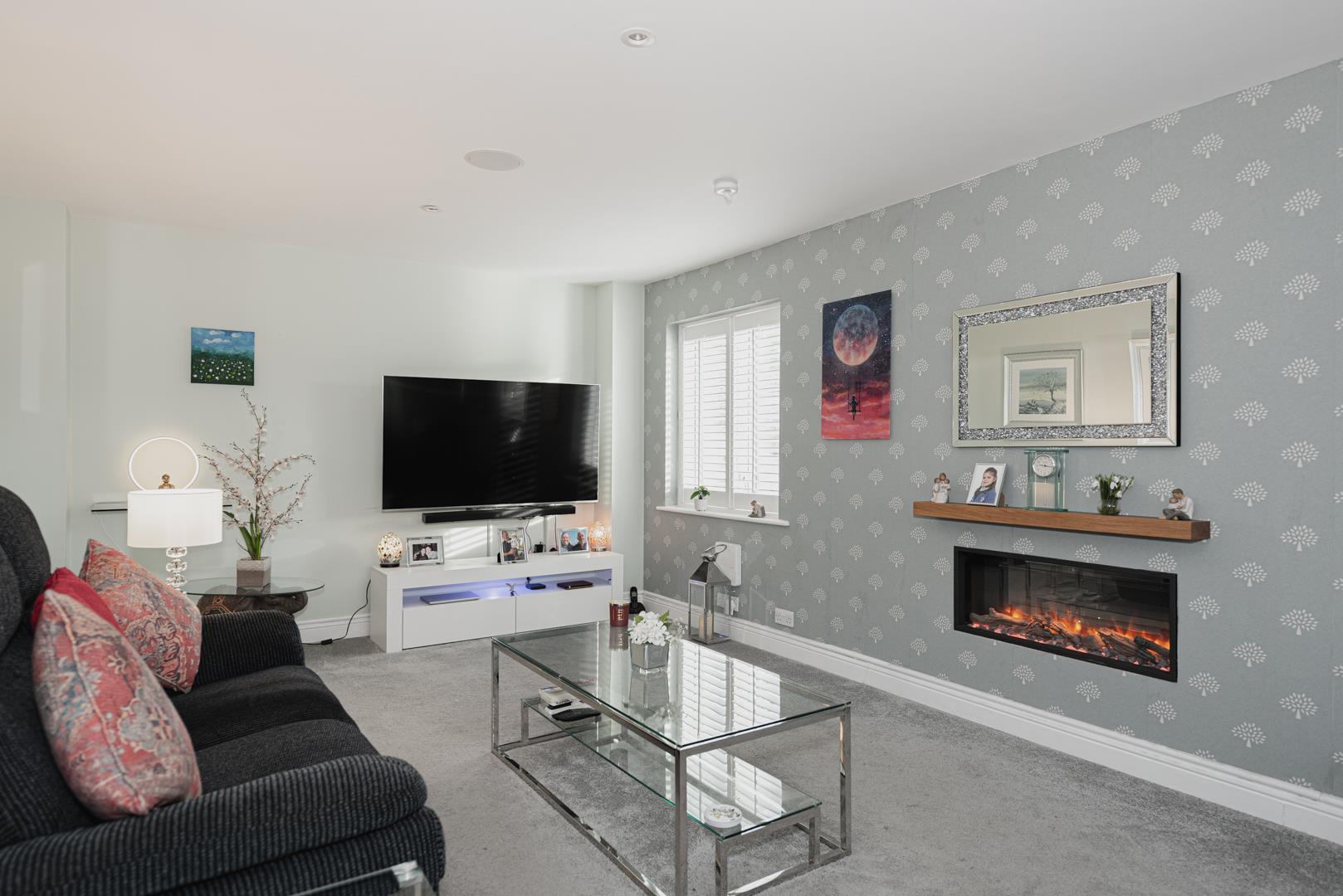 The accommodation comprises dual aspect living room with modern fireplace and plantation style shutters, kitchen/breakfast room, downstairs cloakroom, master bedroom with en-suite, three further bedrooms and a family bathroom.