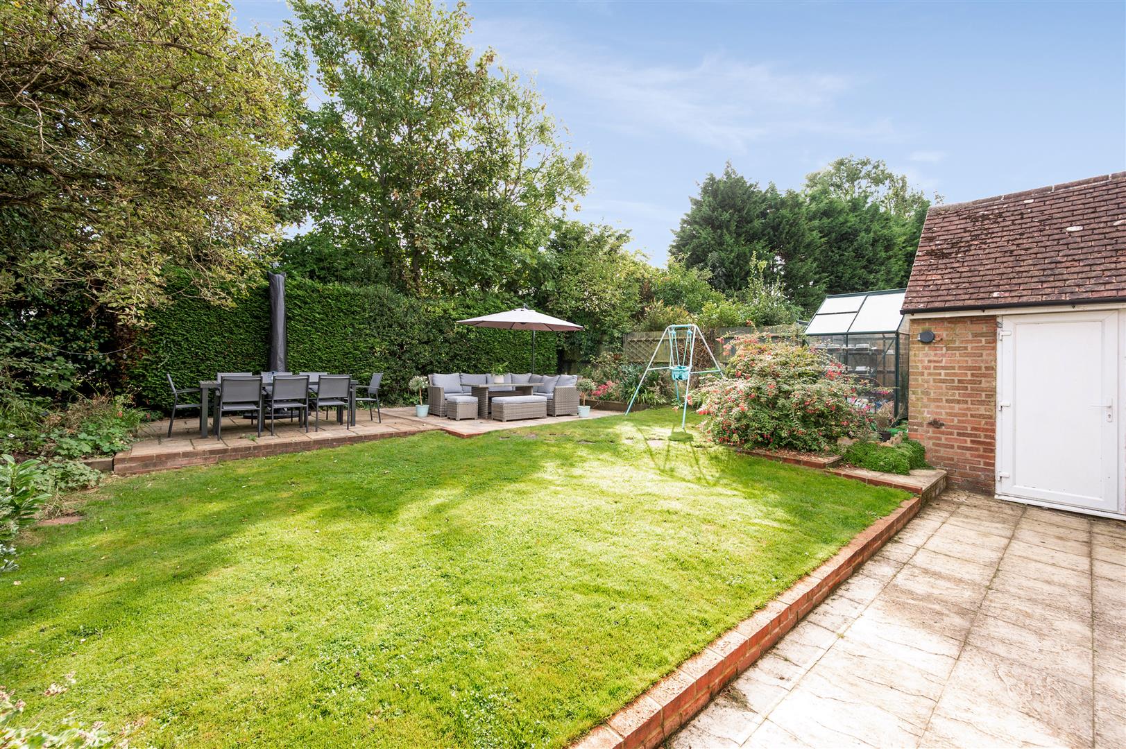 Enjoying a well balanced frontage, the property has ample off street parking on a paved driveway and an attached garage. The beautifully secluded rear garden is nicely proportioned with a central lawn area and seating area for a dining table and garden furniture.