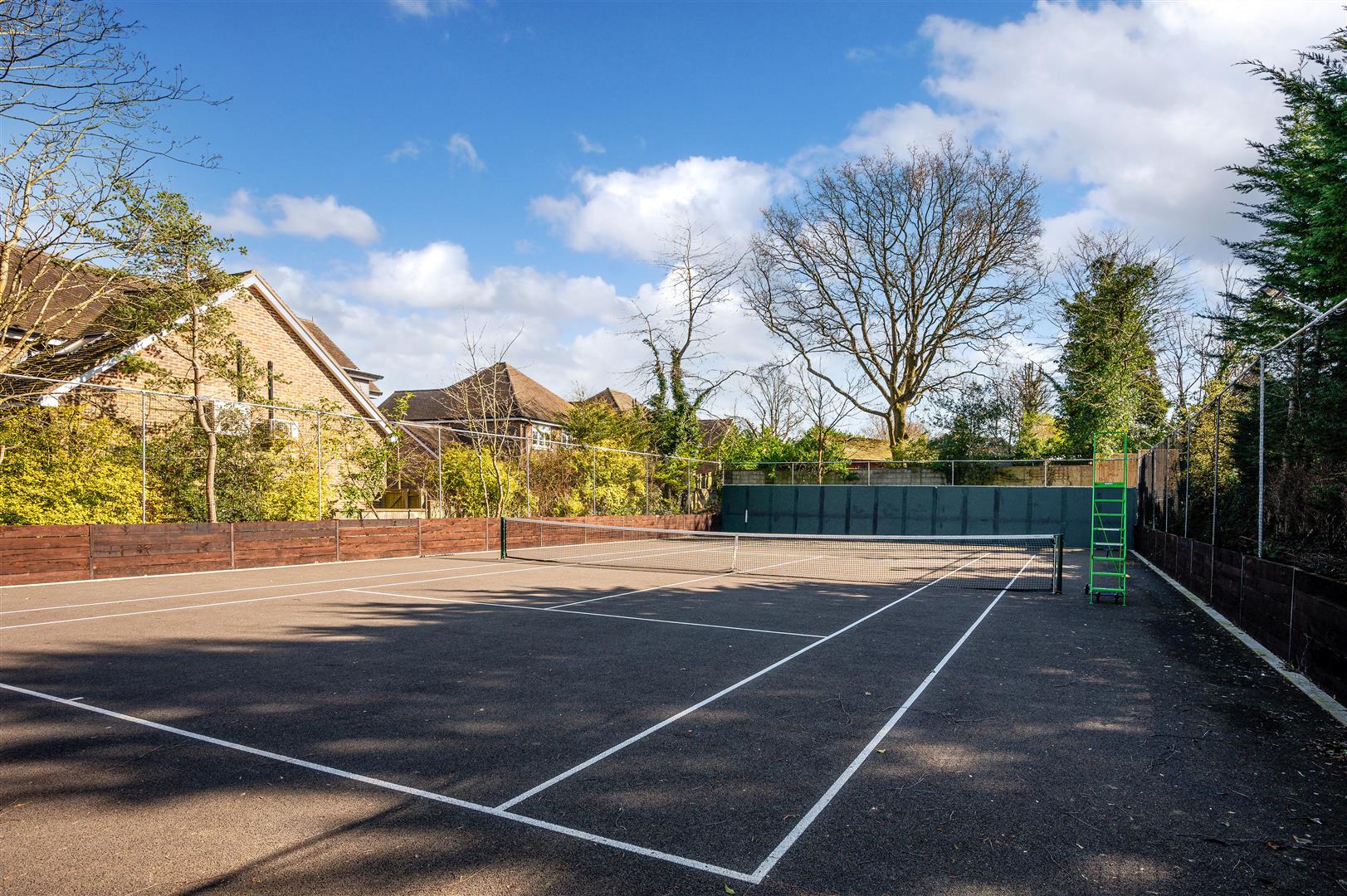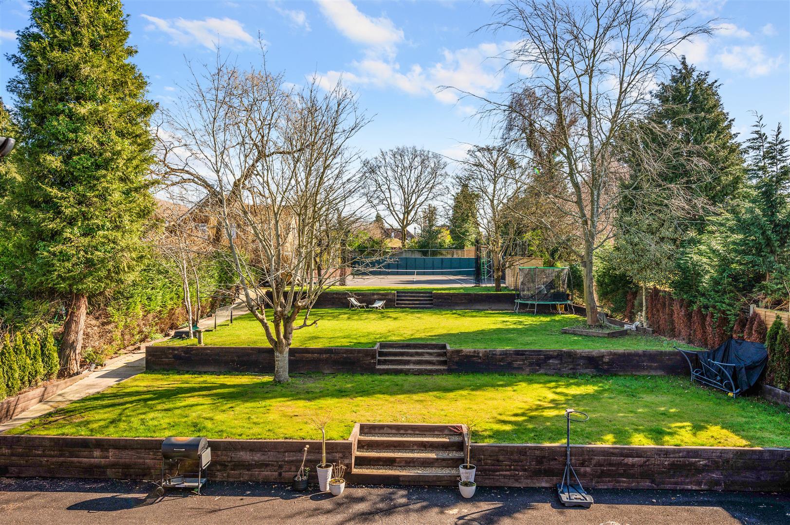 Our clients have completely transformed the 250ft x 65ft South/Easterly facing garden, with tasteful landscaping and the creation of a full size, all weather tennis court which also benefits from being flood lit too.