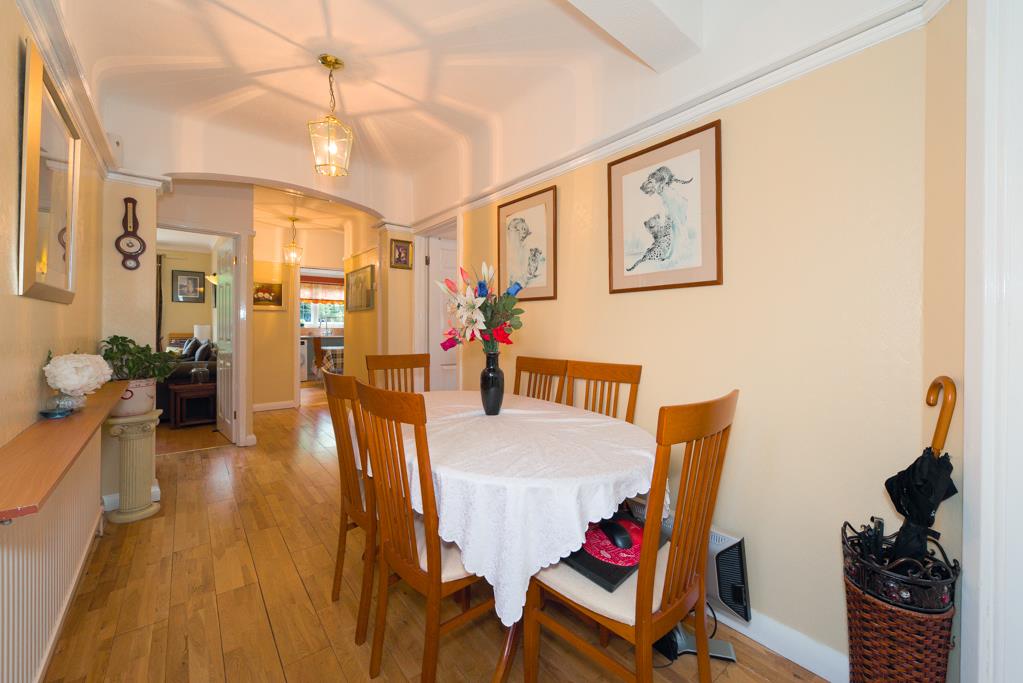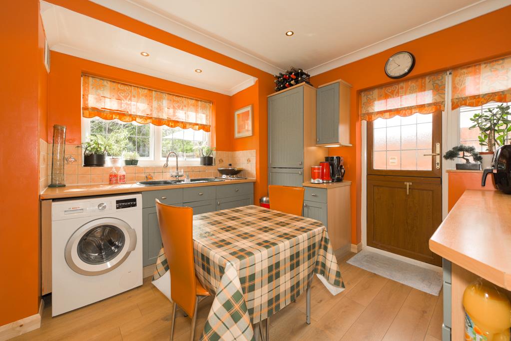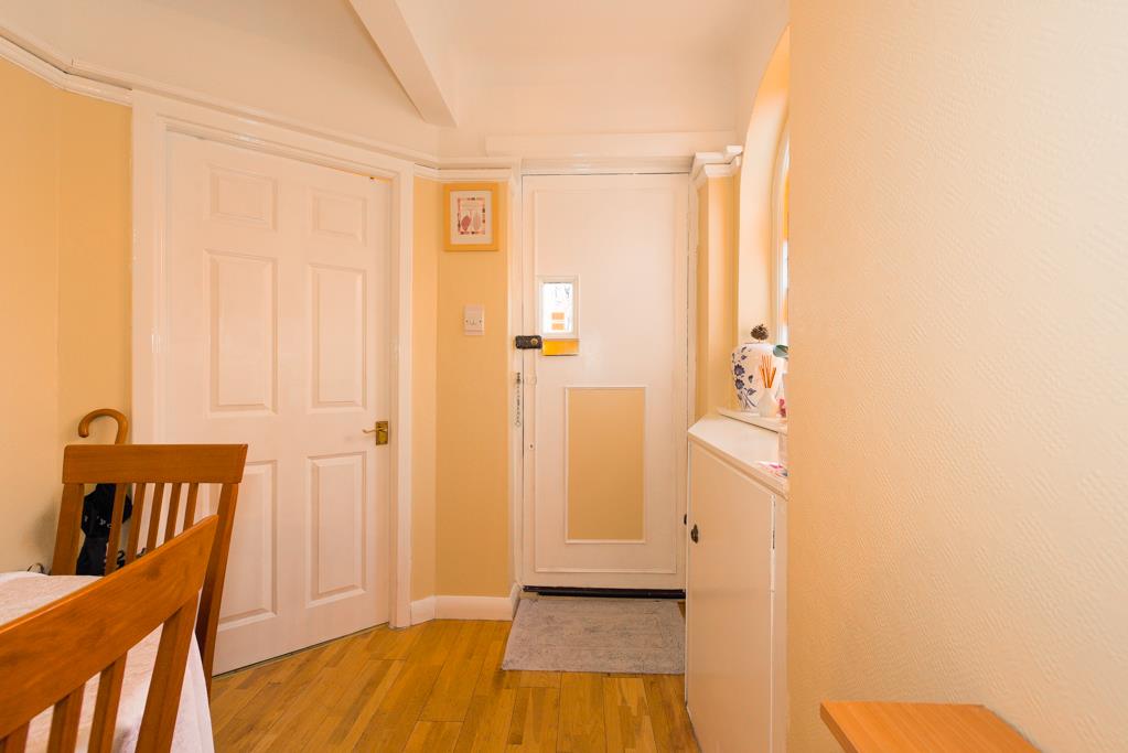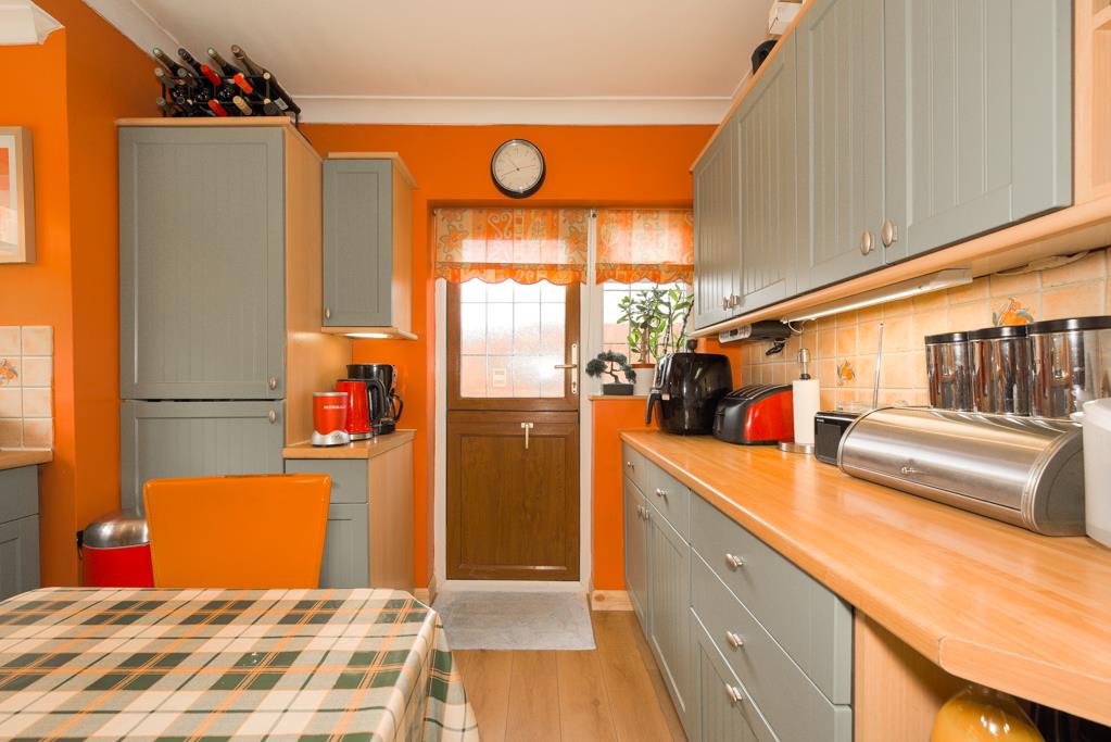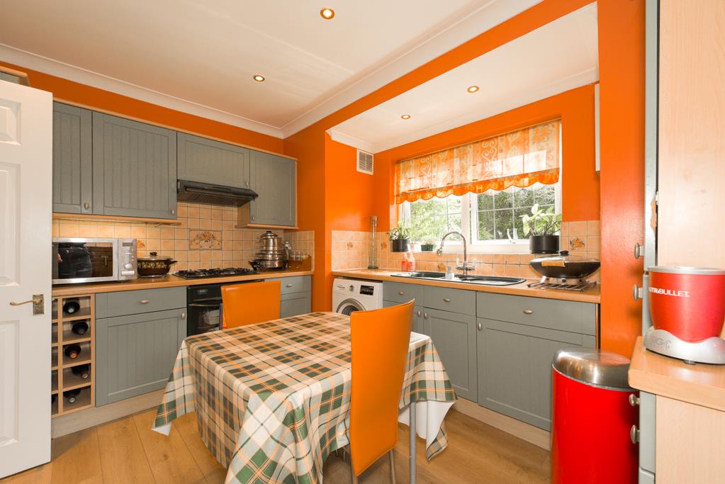 The property comprises an entrance hall with access to built-in storage, the hall is extremely spacious and is currently being used as a dining area, 14ft rear aspect living room with sliding doors overlooking and opening onto the garden with a feature fireplace, 12ft kitchen/breakfast room with a window overlooking the garden and a door to the side, the kitchen comprises a range of eye and base level units with built-in oven and hob.