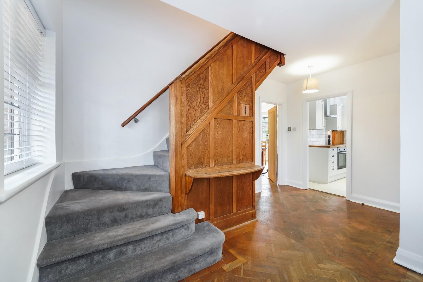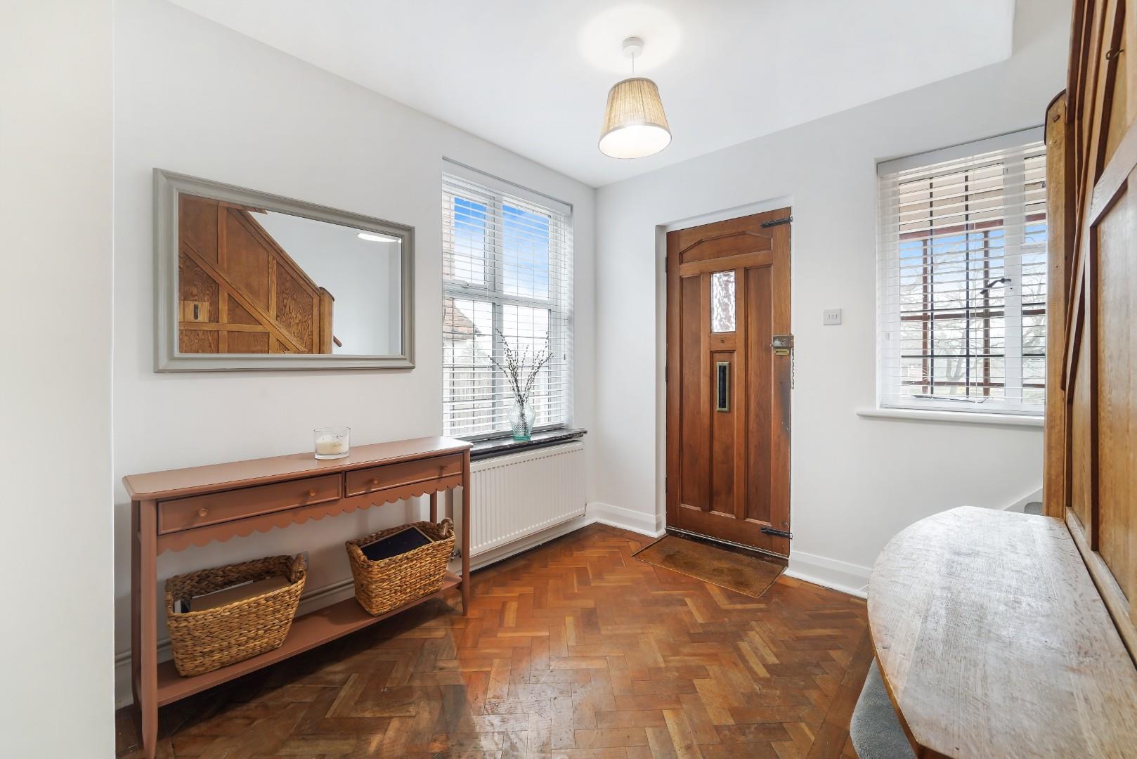 A practical enclosed porch provides the perfect transition into the home and leads through to a welcoming entrance hall that immediately sets the tone for the property. Beautiful wood panelling creates a characterful first impression, while the original parquet flooring adds warmth and charm and continues through into the two generous reception rooms.
